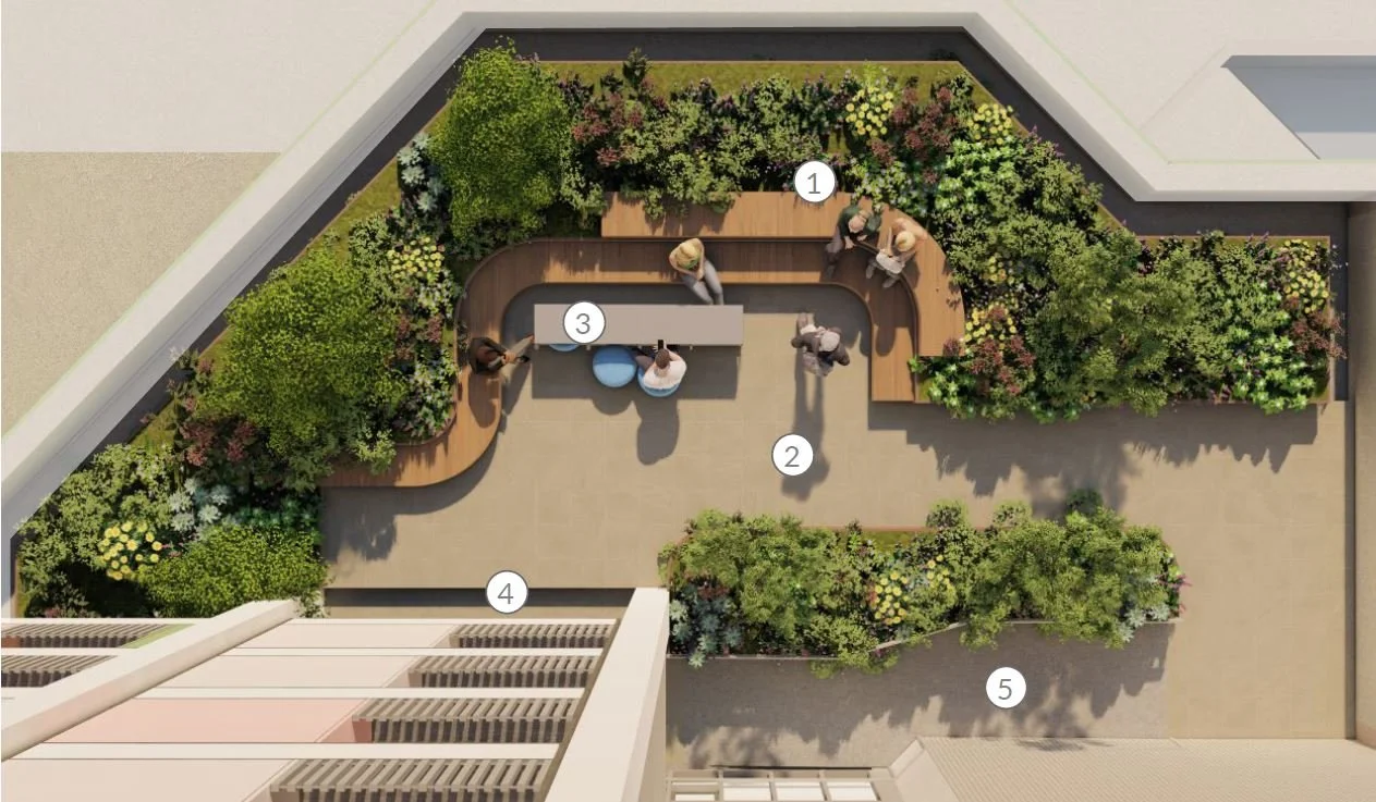 First-floor terrace – Featuring terraced seating and relaxation areas, as well as a small amphitheatre for gathering